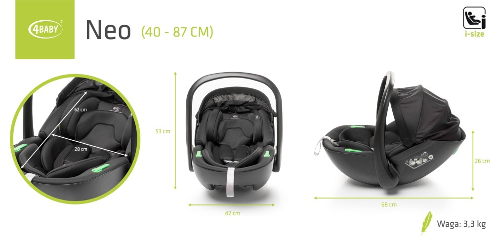 Neo i-Size также может использоваться в качестве переноски для младенцев в дорожных системах – он совместим с колясками, оснащенными универсальными адаптерами, что обеспечивает удобство как в дороге, так и во время повседневных прогулок.